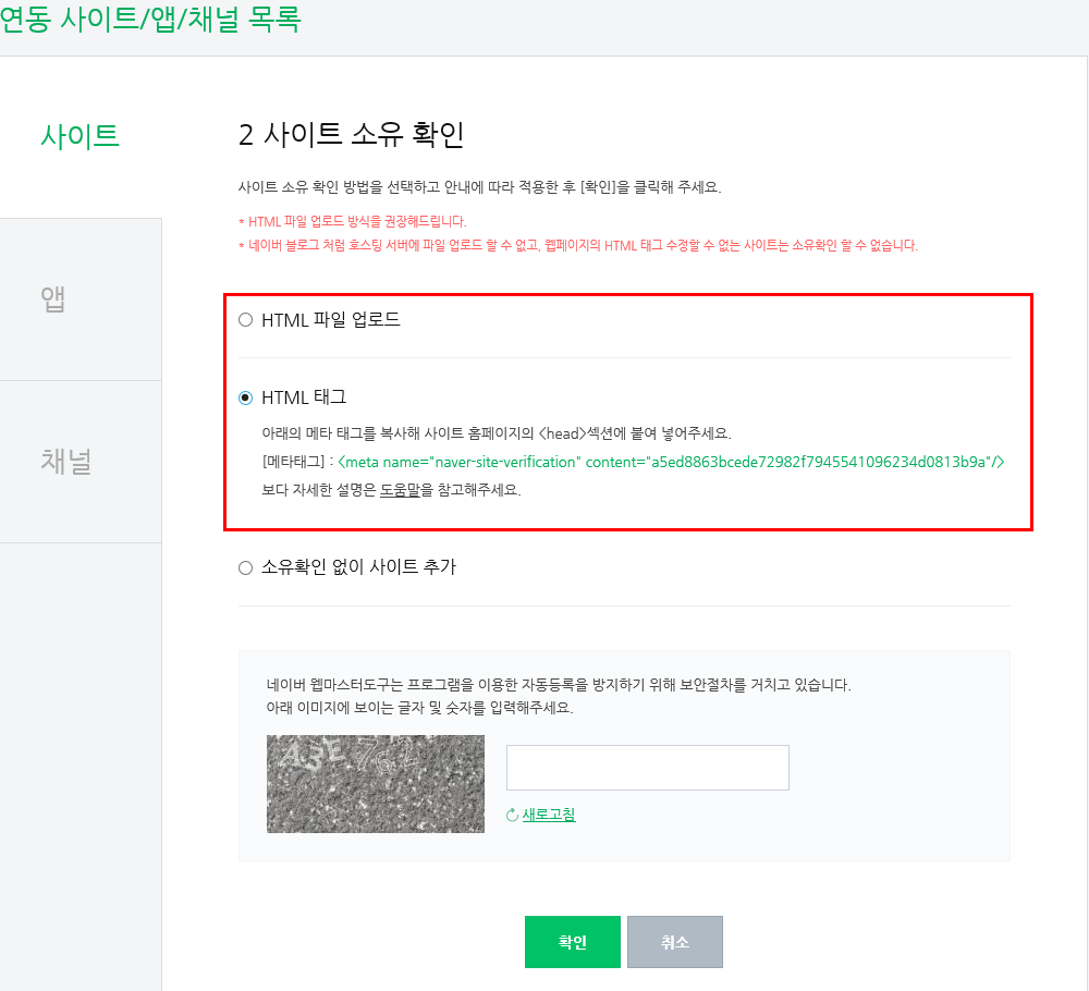 다른 분들은 html 파일을 다운 받아 meta태그를 넣으시던지 아니면 html 업로드해서 소유자 인증을 꼭 받으셔야 합니다.